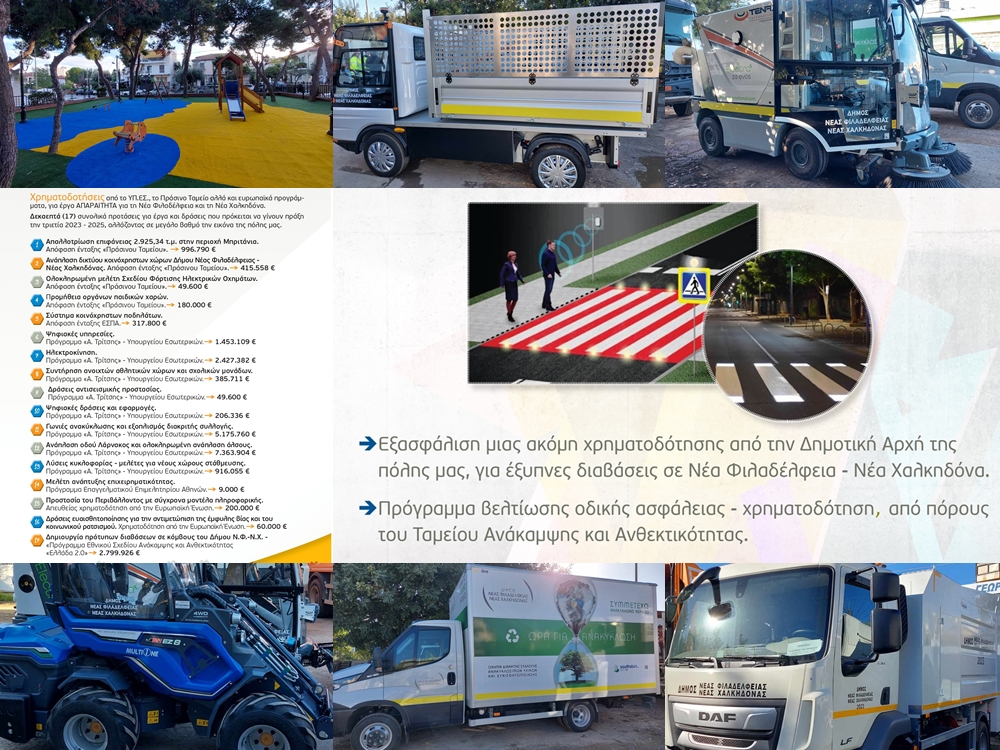 Πρόκειται για ένα μέρος μόνο των έργων και των δράσεων που υλοποιήθηκαν και υλοποιούνται με τις χρηματοδοτήσεις που εξασφάλισε με πολλή δουλειά, συντονισμένες προσπάθειες και μεράκι η δημοτική μας αρχή και που αν αξιοποιηθούν όπως έχουμε σχεδιάσει θα αλλάξουν σε μεγάλο βαθμό την εικόνα της Νέας Φιλαδέλφειας και της Νέας Χαλκηδόνας, βελτιώνοντας σε σημαντικό βαθμό την καθημερινότητα στην όμορφη πόλη μας.