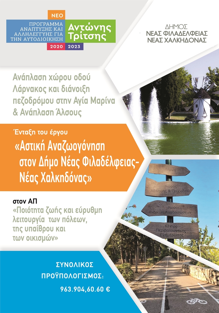 Ενημερώνουμε τους συμπολίτες μας για την ένταξη του έργου, «Αστική Αναζωογόνηση στον Δήμο Νέας Φιλαδέλφειας – Νέας Χαλκηδόνας» στο Πρόγραμμα «ΑΝΤΩΝΗΣ ΤΡΙΤΣΗΣ» και συγκεκριμένα στον Άξονα Προτεραιότητας «Ποιότητα ζωής και εύρυθμη λειτουργία των πόλεων, της υπαίθρου και των οικισμών» συνολικού προϋπολογισμού 963.904,60 €, έπειτα από σχετική απόφαση του Αναπληρωτή Υπουργού Εσωτερικών, κ. Στέλιου Πέτσα.