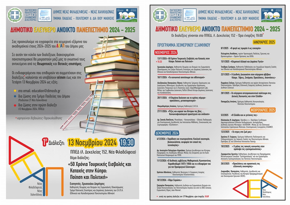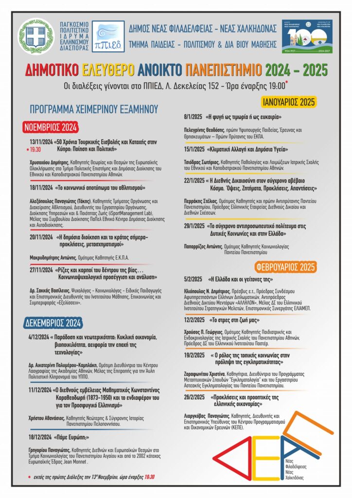 Είναι μεγάλη η χαρά μας που διακεκριμένοι πανεπιστημιακοί θα μοιραστούν μαζί μας αφιλοκερδώς το γνωστικό τους αντικείμενο από τις θεωρητικές και θετικές επιστήμες και θα μας φέρουν σε επαφή με τα πολύτιμα αγαθά της γνώσης, της επιστήμης και του πνεύματος μέσω της λειτουργίας του Δημοτικού Ελεύθερου Ανοικτού Πανεπιστημίου (ΔΕΑΠ) του Δήμου μας.