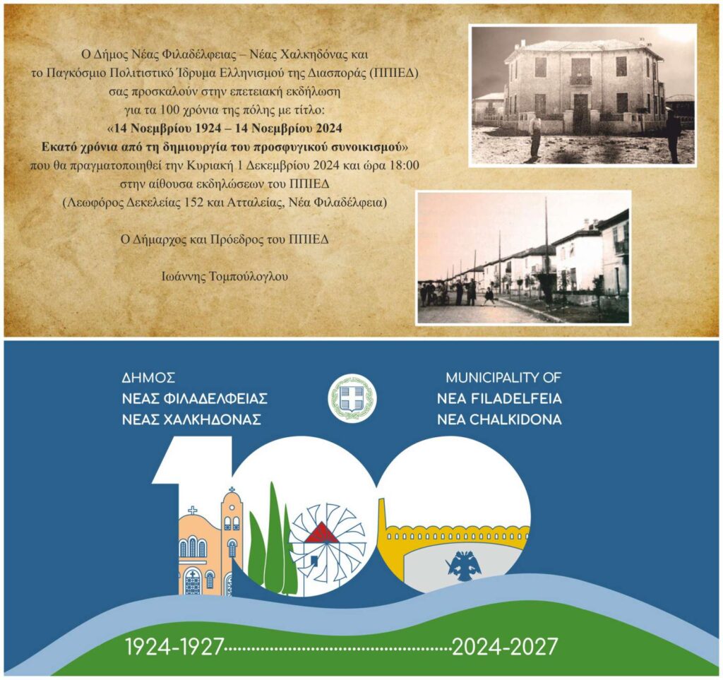 Ο Δήμος Νέας Φιλαδέλφειας-Νέας Χαλκηδόνας και το Παγκόσμιο Πολιτιστικό Ίδρυμα του Ελληνισμού της Διασποράς (Π.Π.Ι.ΕΔ.) διοργανώνουν επετειακή εκδήλωση για τη συμπλήρωση 100 χρόνων από την ίδρυση της πόλης μας με τίτλο: «14 Νοεμβρίου 1924–14 Νοεμβρίου 2024, Εκατό χρόνια από τη δημιουργία του προσφυγικού συνοικισμού».