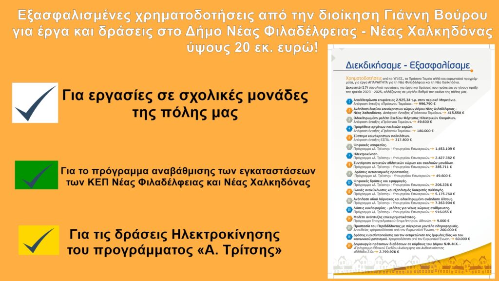 Κλείνοντας. Το δεδομένο για την ώρα είναι πως η δημοτική αρχή Γιάννη Βούρου εξασφάλισε για δράσεις και έργα στο Δήμο Νέας Φιλαδέλφειας – Νέας Χαλκηδόνας 20 εκ ευρώ, ενώ η δημοτική αρχή Τομπούλογλου επέβαλε ΧΑΡΑΤΣΙ 77% στα δημοτικά τέλη των συμπολιτών μας.
