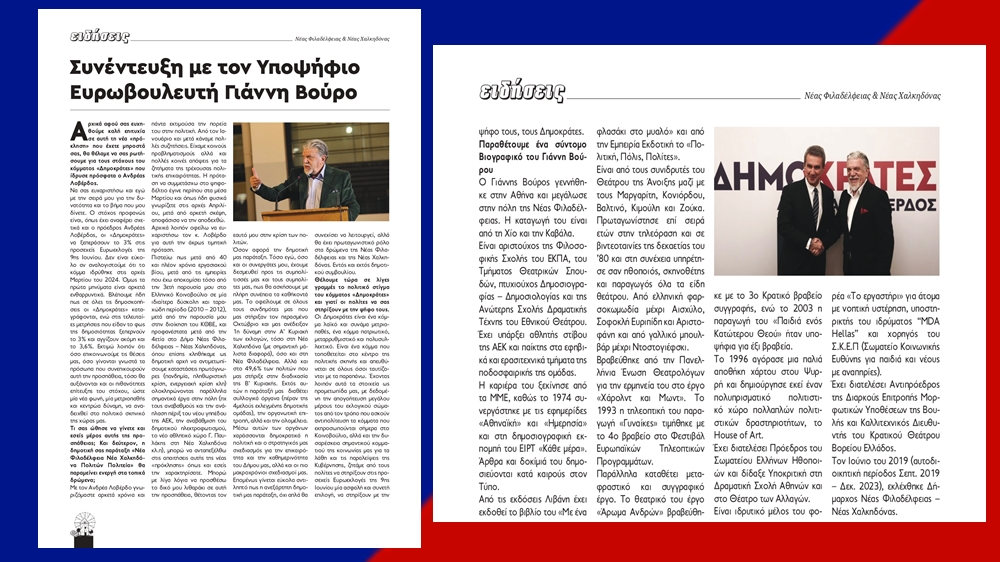 Διαβάστε την αποκλειστική συνέντευξη που παραχώρησε στο 2ο φύλλο της εφημερίδας μας ο πρ. Δήμαρχος Νέας Φιλαδέλφειας – Νέας Χαλκηδόνας και υποψήφιος ευρωβουλευτής Γιάννης Βούρος!