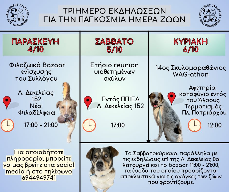 “Στα 20 περίπου χρόνια εθελοντικής προσφοράς στα αδέσποτα πλάσματα της πόλης μας , το Α και το Ω της δράσης μας στηρίζεται στη λέξη ΑΓΑΠΩ και μόνο σε αυτή. Σε όλες τις φίλες και τους φίλους του συλλόγου μας , σε όλους εσάς τους πολύτιμους ανθρώπους που υποστηρίζετε το φιλοζωικό μας αγώνα και έχουμε χτίσει σχέσεις καρδιάς και εμπιστοσύνης , απευθύνουμε πρόσκληση για την τριήμερη εκδήλωση μας που θα πραγματοποιηθεί στις 4-5-6 Οκτωβρίου , στον πεζόδρομο του άλσους της Νέας Φιλαδέλφειας και στο ύψος του ΠΙΠΙΕΔ Λεωφόρος Δεκελείας 152.