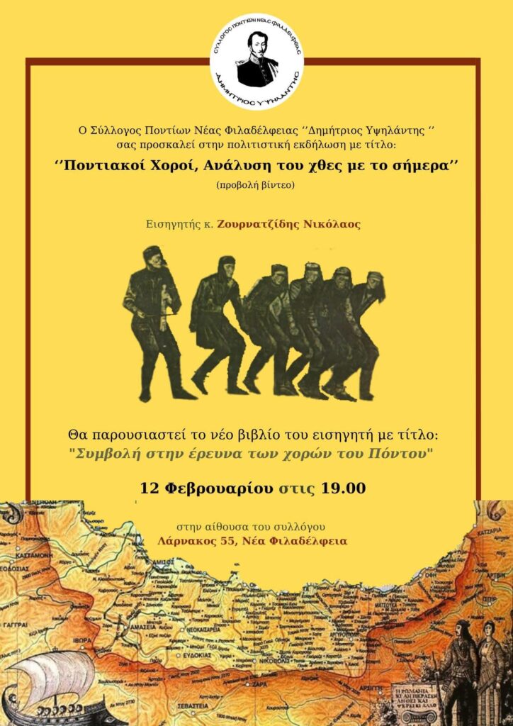 Ο Συλλογος Ποντίων Νέας Φιλαδέλφειας «Δημήτριος Υψηλάντης» σας προσκαλεί στις 12 Φεβρουαρίου 2025 και ώρα 19:00, στην αίθουσα του συλλόγου, στην πολιτιστική εκδήλωση με τίτλο: