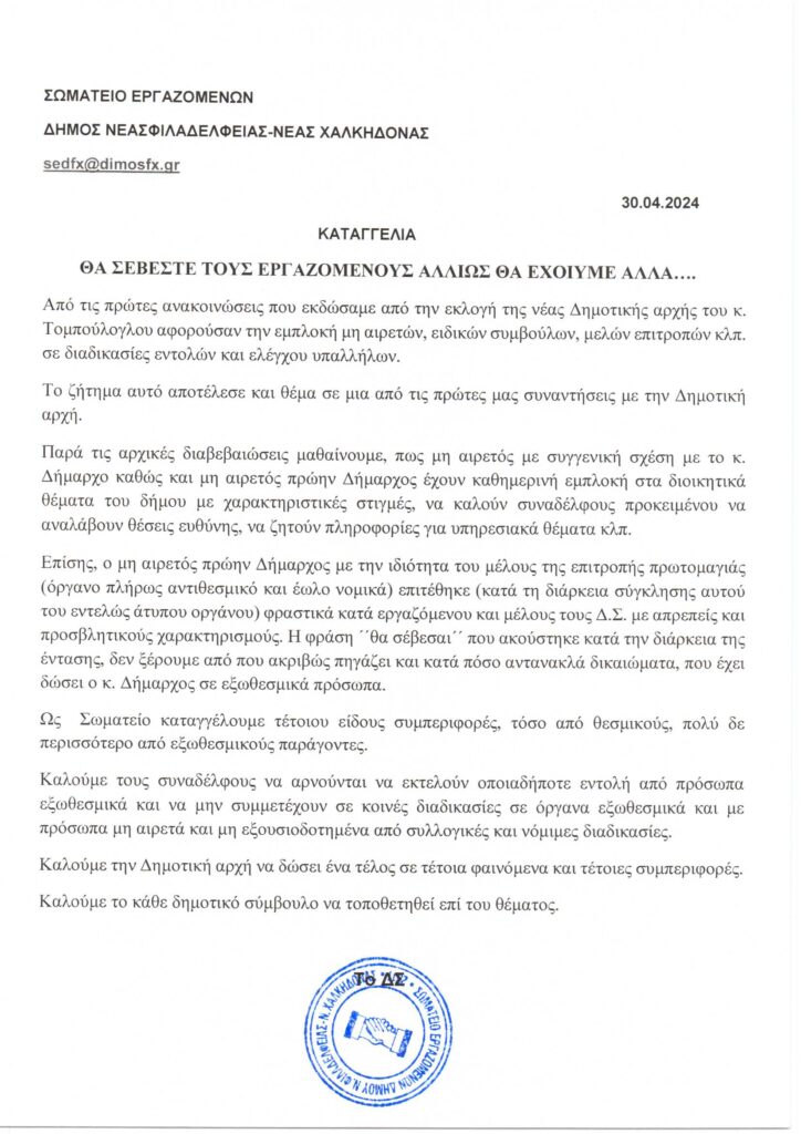 Από το Σωματείο Εργαζομένων του Δήμου Νέας Φιλαδέλφειας – Νέας Χαλκηδόνας λάβαμε την παρακάτω ανακοίνωση – καταγγελία: