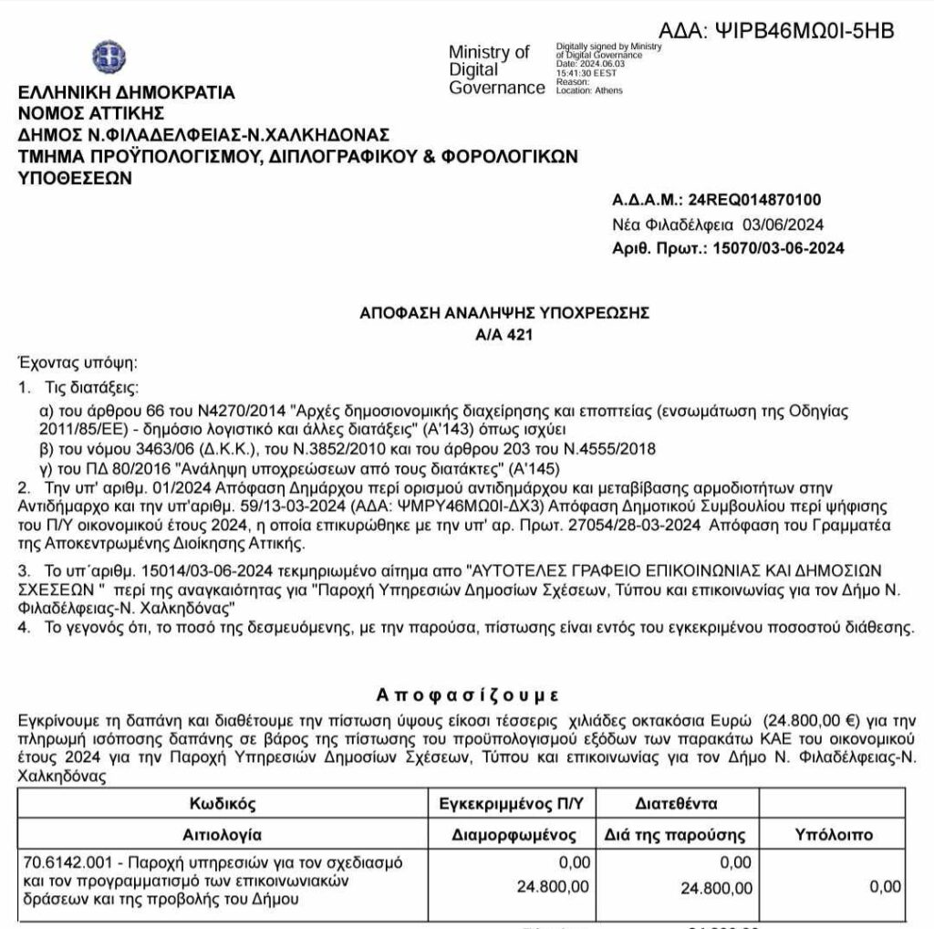 Η Δημοτική Αρχή Τομπούλογλου που ήδη διοικεί συνεπικουρούμενη από 4 έμμισθους ειδικούς συμβούλους, 1 έμμισθο ειδικό συνεργάτη, τον γενικό γραμματέα του Δήμου, τον Συμπαραστάτη του Δημότη (θέση που προκήρυξε), τώρα προχωρά στην έγκριση δαπάνης 24.800€ για την παροχή υπηρεσιών Δημοσίων Σχέσεων, Τύπου & Επικοινωνίας. Δείτε το σχετικό έγγραφο που αναρτήθηκε πριν μερικές ημέρες στην ΔΙΑΥΓΕΙΑ του Δήμου Νέας Φιλαδέλφειας – Νέας Χαλκηδόνας.